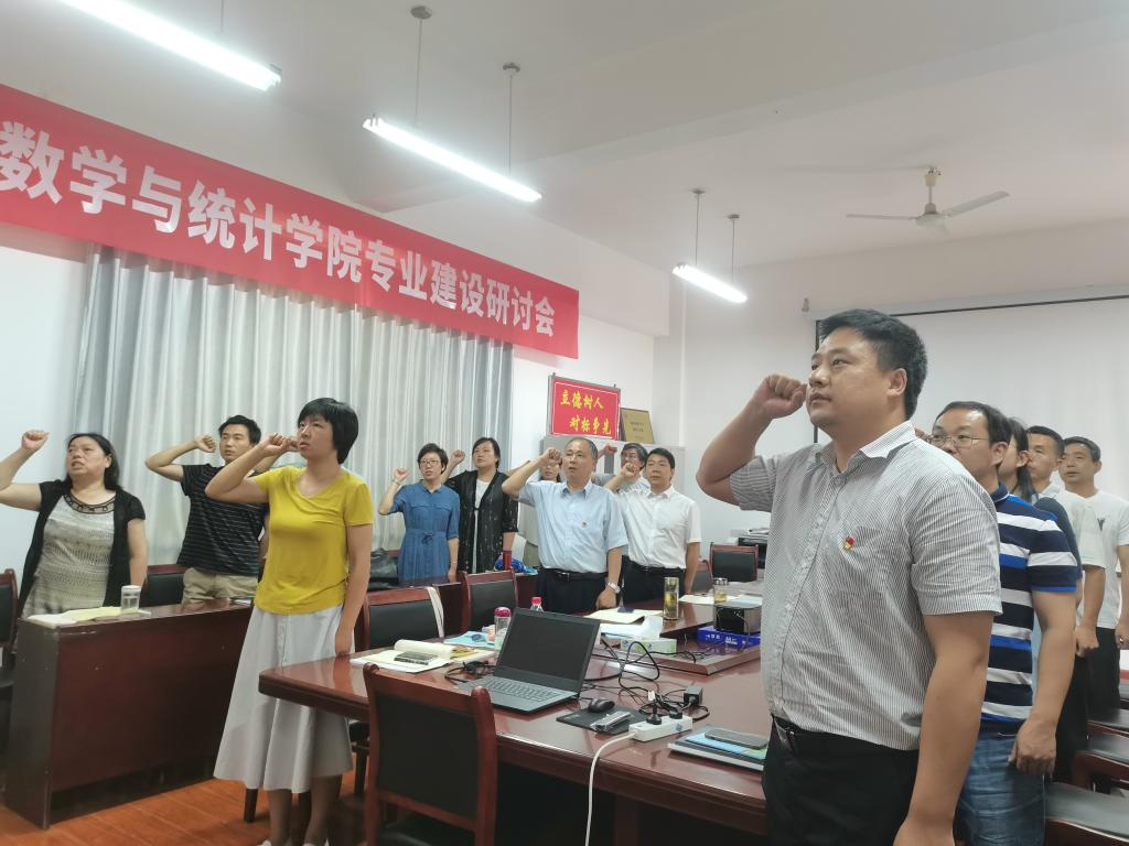 主题党日活动按照“回顾初心、党性教育、民主议事、实践锻炼”四个板块要求进行,全体党员首先在公司会议室集中进行奏唱国歌、重温入党誓词两项议程。议程由数学与应用数学系教师党支部书记杨艳主持,信息与计算科学系教师党支部陶茂虎博士领誓。