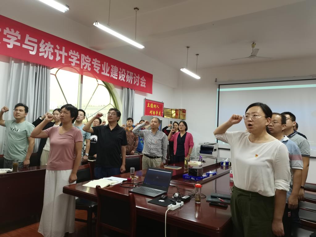主题党日活动按照“回顾初心、党性教育、民主议事、实践锻炼”四个板块要求进行,全体党员首先在公司会议室集中进行奏唱国歌、重温入党誓词两项议程。议程由信息与计算科学系教师党支部书记唐波主持,数学与应用数学系教师党支部书记杨艳领誓。