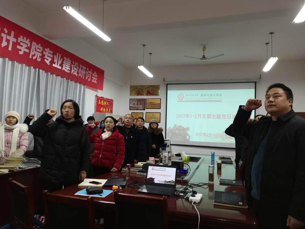 主题党日按照“回顾初心、党性教育、民主议事、实践锻炼”四个板块要求进行,全体党员首先在公司会议室集中进行奏唱国歌、重温入党誓词两项议程。主题党日由数学与应用数学系教师党支部书记杨艳主持、信息与计算科学系教师党支部书记陶茂虎领誓。