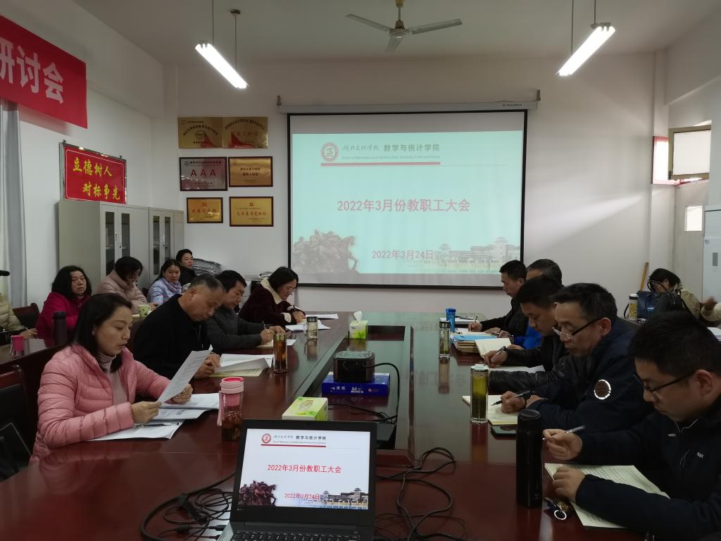 刘浩就党建与思想政治工作、党风廉政建设、作风建设“奋进年”活动、清廉数统建设、师德师风建设、酒驾醉驾专项治理、年度目标任务、疫情防控、节约粮食节约用水用电等工作进行安排部署。他要求,一是要认真学习贯彻全国两会精神,贯彻新发展理念,以内涵建设推进公司高质量发展,细化工作任务,抓住影响公司发展的关键环节,加强团队队伍建设、学科专业建设,抓好专业认证、学科科研团队、教学团队建设,抓课程,抓质量,引领师生以更加振奋的精神状态投身公司各项工作,为办大办强办好公司而不懈努力奋斗。二是要认真践行以人民为中心的发展思想,巩固拓展党史学习教育成果,统筹做好疫情防控和公司产品工作,确保师生安全,确保良好的教学秩序,做到防控不松懈、发展不停步,把学党史、用党史作为终身课,在推动年度目标任务完成、推动重点工作取得新成绩、推动公司高质量发展中体现担当和作为,以优异成绩迎接党的二十大胜利召开。