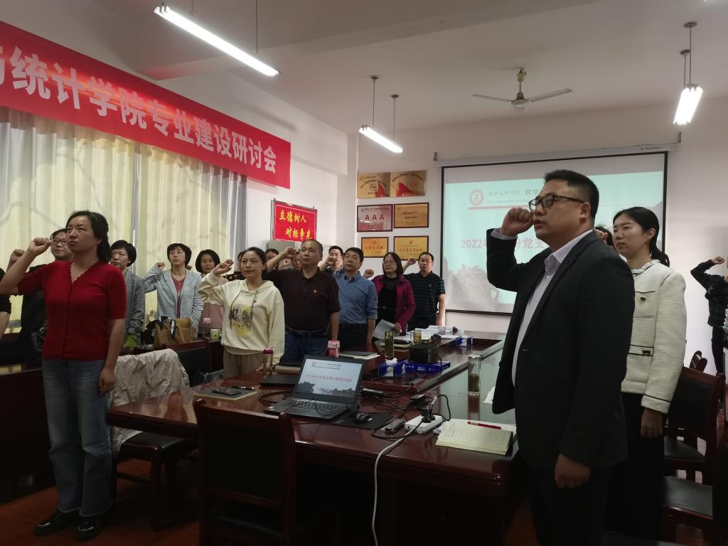 主题党日按照“回顾初心、党性教育、民主议事、实践锻炼”四个板块要求进行,全体党员首先在公司会议室集中进行奏唱国歌、重温入党誓词两项议程,由数学与应用数学系教师党支部书记杨艳主持、信息与计算科学系教师党支部书记陶茂虎领誓。