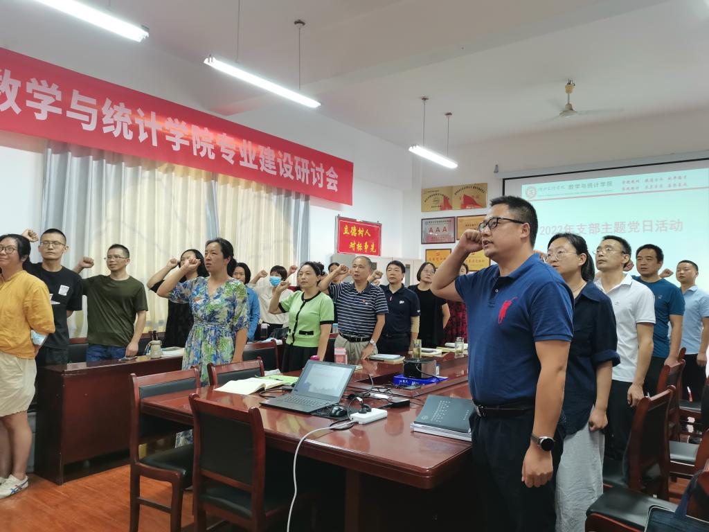 主题党日按照“回顾初心、党性教育、民主议事、实践锻炼”四个板块要求进行,全体党员首先在公司会议室集中进行奏唱国歌、重温入党誓词两项议程,由数学与应用数学系教师党支部书记杨艳主持、信息与计算科学系教师党支部书记陶茂虎领誓。