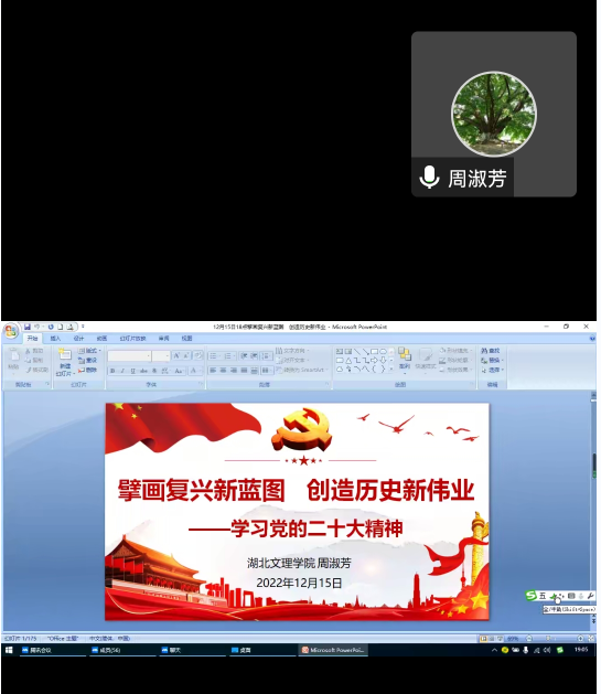 周淑芳教授报告的主题为《擘画复兴新蓝图 创造历史新伟业》。报告从必须深入分析国际国内大势、过去五年的工作和新时代十年的伟大变革、归根到底是两个“行”、以中国式现代化全面推进中华民族伟大复兴、深入推进新时代党的建设新的伟大工程五个方面对党的二十大精神进行详细解读。