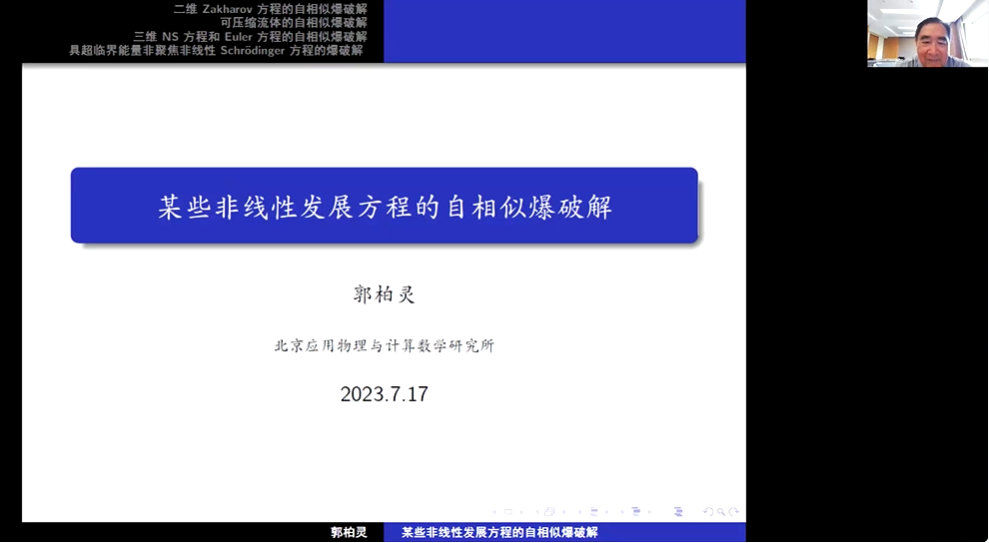 开班仪式上有三个学术报告。张彦铎董事长主持了郭柏灵院士的学术报告《某些非线性发展方程的自相似爆破解》。随后北京师范大学数学科学公司党委书记唐仲伟教授和西南财经大学杰青赵琳教授分别为讲习班的学员们分享了他们的学术成果《Compactness and existence results of the prescribing fractional Q-curvature problem》《Benchmark Stochastic Dominance: Ranking Risk Prospects under Imprecise Preferences》