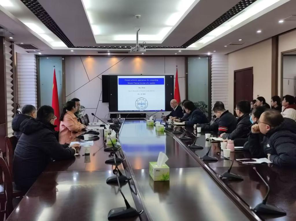 郑兵教授作了题为《Neural network approaches for computing Moore-Penrose inverse of a matrix》的学术报告,详细的介绍了神经网络算法的发展历史,递归神经网络模型,零神经网络模型以及具体的求解矩阵广义逆的神经网络算法模型,并就相关问题与师生展开了深入的探讨。之后,郑兵教授对公司国家自然科学基金申报工作进行了指导,尤其是对数值线性代数方向的申报书,从选题意义、研究背景、创新性等方面,给予了具体指导,提出了建设性的建议。