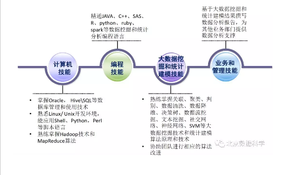 经过总结国内外人才培养经验与国内市场需求,大数据高端人才需要如下技能: