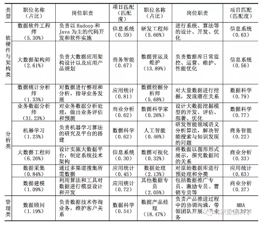 通过上表内容对比可以看出,信息系统方向的项目基本满足软件类的岗位要求;分析类项目涉及的研究方向较多,主要包括应用统计、商业分析、商务智能和数据科学;MBA方向则是与管理类职位最为匹配,借鉴国外高校大数据人才培养的先进经验对我国大数据人才的培养很有意义。但是还有部分职位如人工智能,作为当前关注度最高的职位之一。